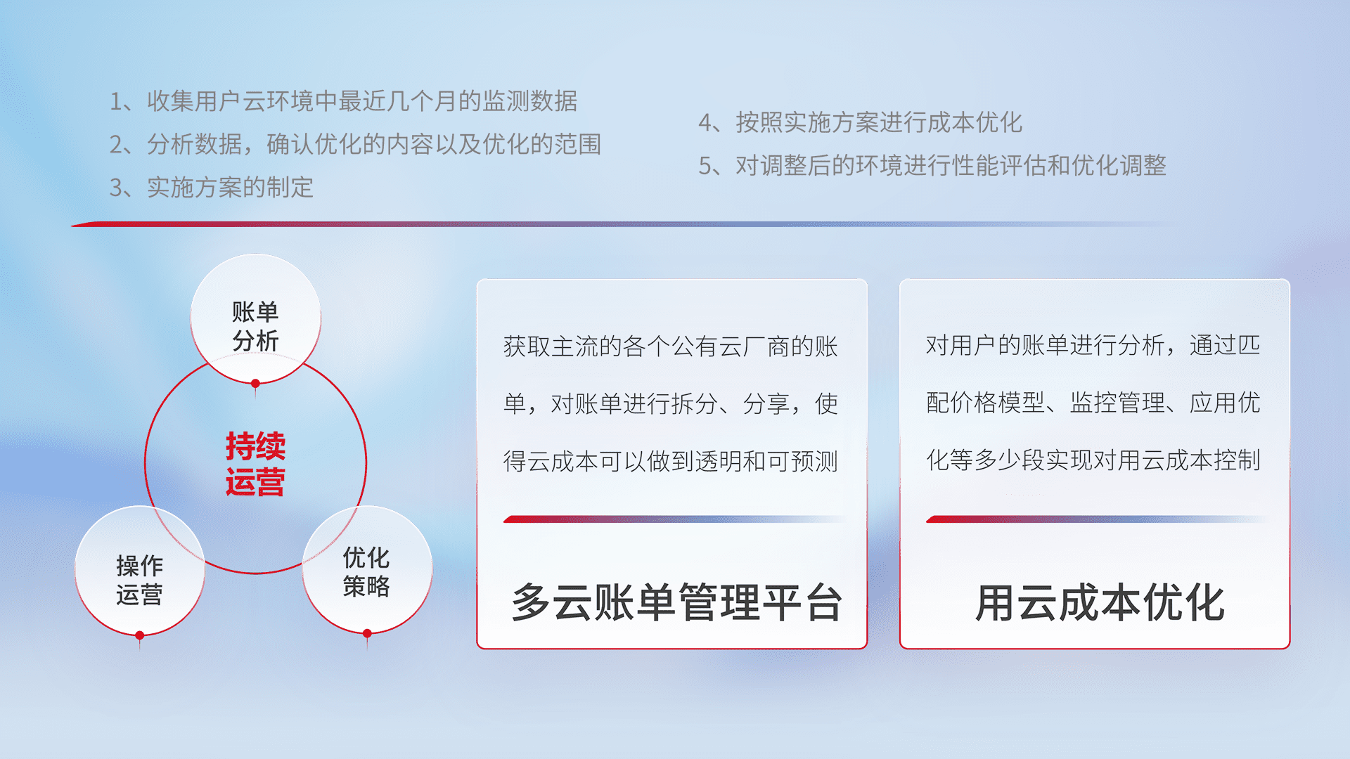 通过多云纳管,,以统一的资源数据模型把客户的云资源进行抽象和封装,,进而实现对多云资源的统一操作,,,保障云资源管理的可靠性、、、稳定性与可用性。。。量身定制化运维内容,,配置、、、开发运维、、、补丁管理、、、备份、、、监控、、、、认证和访问管理、、审计和日常巡检等,,,保障在用云过程中的可靠度,,,稳定度以及高可用率。。