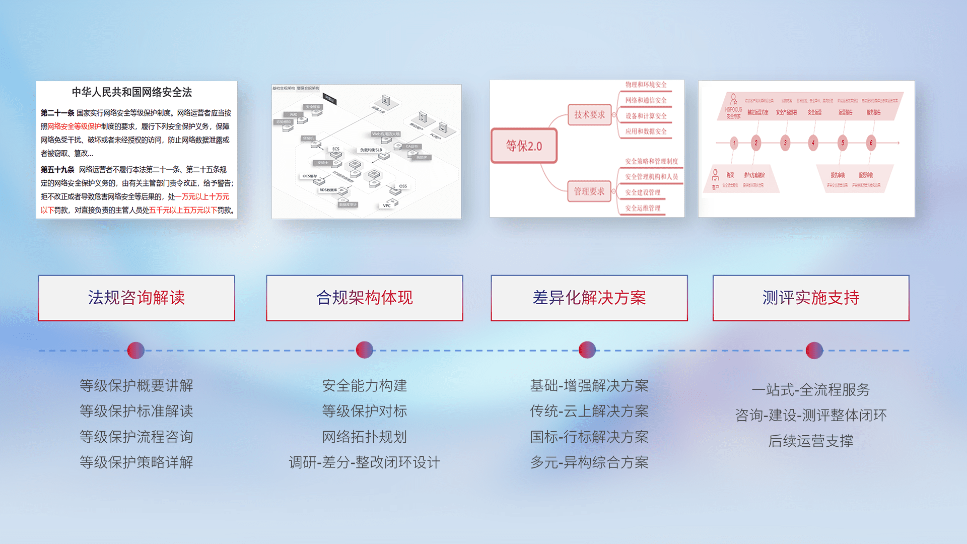 通过专业的法律咨询解读、、、合规架构体现、、差异化解决方案、、、、测试实施支持等服务,,,,为客户量身打造等保合规体系。。